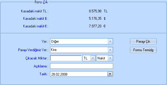 TL, $ ve € için ayrı ayrı kasa hesabı tutulmaktadır. Siz kasadan TL çıkışı yaparsanız bu kasadaki TL hesabına yansır. Aynı şey $ ve € içinde geçerlidir.