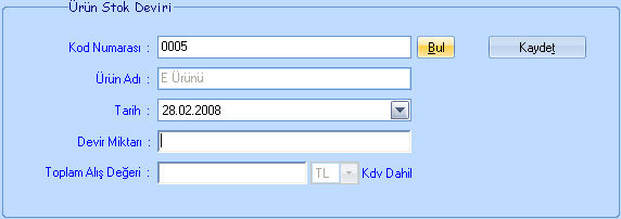 Ürün stok devirlerinizi bu ekrandan yapabilirsiniz. Programı kullanmaya başladığınızda tanımladığınız ürünlerin mevcut stok miktarlarını buradan işleyebilirsiniz. Burada önemli olan nokta, toplam alış değeridir. Kar - Zarar hesabı ve maliyet hesabı yapılırken, devir olan ürünlerin sağlıklı bir şekilde hesaplanmasını istiyorsanız, toplam alış değerini doğru girmeye dikkat ediniz.